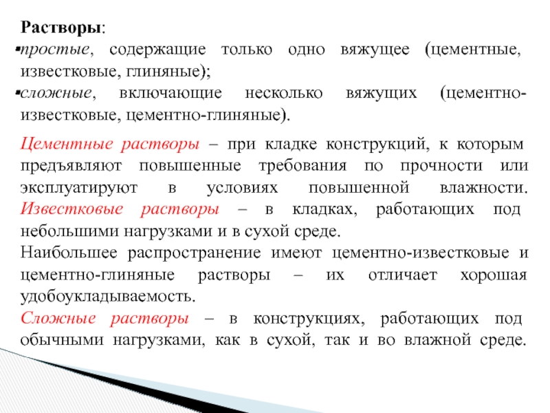 Сложные растворы – в конструкциях, работающих под обычными нагрузками, как в сухой, так и во влажной среде.