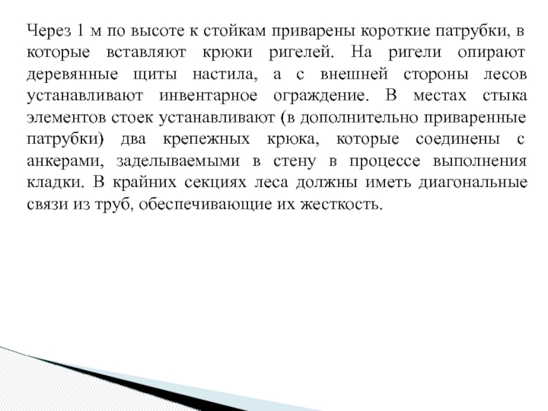 которые вставляют крюки ригелей. На ригели опирают деревянные щиты настила, а с внешней стороны лесов устанавливают инвентарное ограждение. В местах стыка элементов стоек устанавливают (в дополнительно приваренные патрубки) два крепежных крюка, которые соединены с анкерами, заделываемыми в стену в процессе выполнения кладки. В крайних секциях леса должны иметь диагональные связи из труб, обеспечивающие их жесткость.