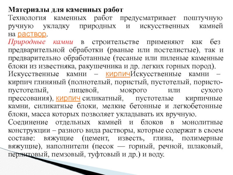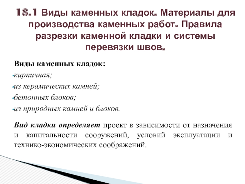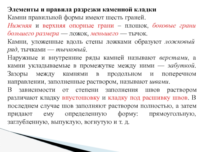 Слайд 318.1 Виды каменных кладок. Материалы для производства каменных работ. Правила разрезки