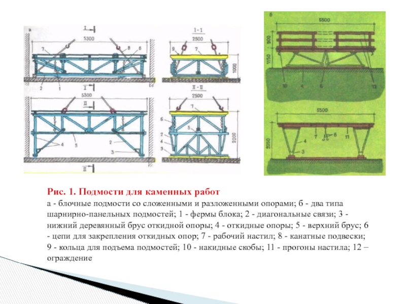 и разложенными опорами; б - два типа шарнирно-панельных подмостей; 1 - фермы блока; 2 - диагональные связи; 3 - нижний деревянный брус откидной опоры; 4 - откидные опоры; 5 - верхний брус; 6 - цепи для закрепления откидных опор; 7 - рабочий настил; 8 - канатные подвески; 9 - кольца для подъема подмостей; 10 - накидные скобы; 11 - прогоны настила; 12 – ограждение