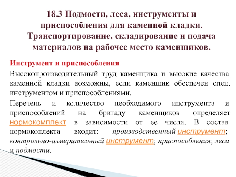18.3 Подмости, леса, инструменты и приспособления для каменной кладки. Транспортирование, складирование и подача материалов на рабочее место каменщиков.