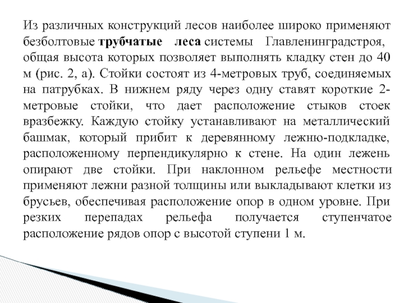 Слайд 49Из различных конструкций лесов наиболее широко применяют безболтовые трубчатые леса системы Главленинградстроя, общая