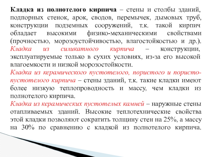 Слайд 4Кладка из полнотелого кирпича – стены и столбы зданий, подпорных стенок,