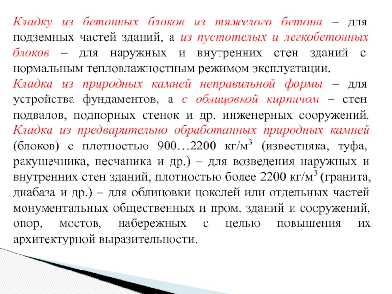 Кладка из предварительно обработанных природных камней (блоков) с плотностью 900…2200 кг/м3 (известняка, туфа, ракушечника, песчаника и др.) – для возведения наружных и внутренних стен зданий, плотностью более 2200 кг/м3 (гранита, диабаза и др.) – для облицовки цоколей или отдельных частей монументальных общественных и пром. зданий и сооружений, опор, мостов, набережных с целью повышения их архитектурной выразительности.