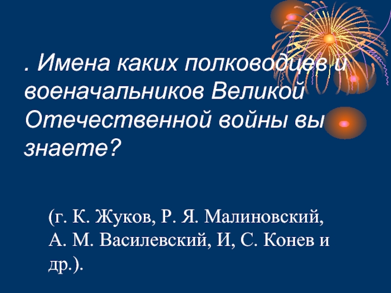 (Александр Невский, Дмитрий Донской, А. В. Суворов, М. И. Кутузов, Федор Ушаков и др.)