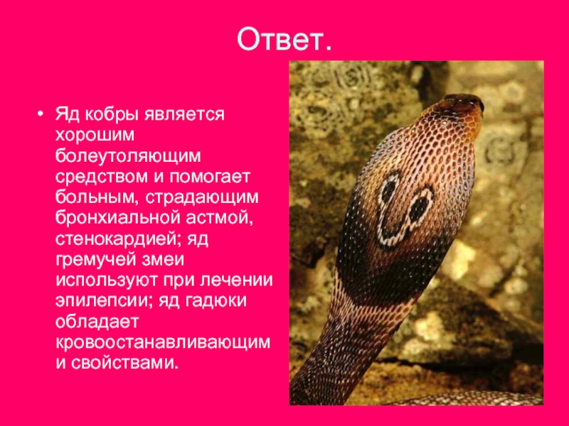 Яд кобры является хорошим болеутоляющим средством и помогает больным, страдающим бронхиальной