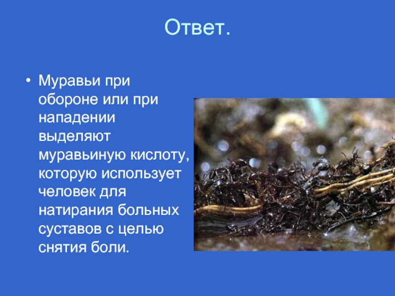Муравьи при обороне или при нападении выделяют муравьиную кислоту, которую использует