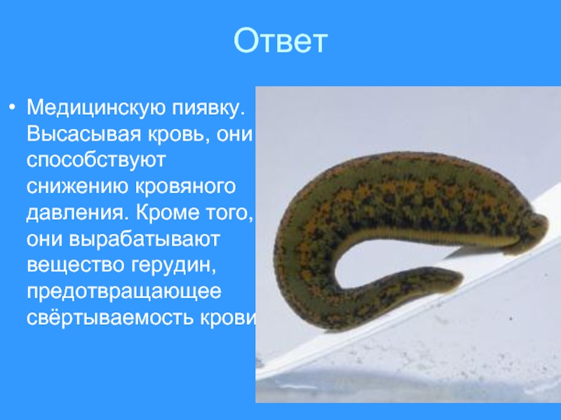 Медицинскую пиявку. Высасывая кровь, они способствуют снижению кровяного давления. Кроме того,