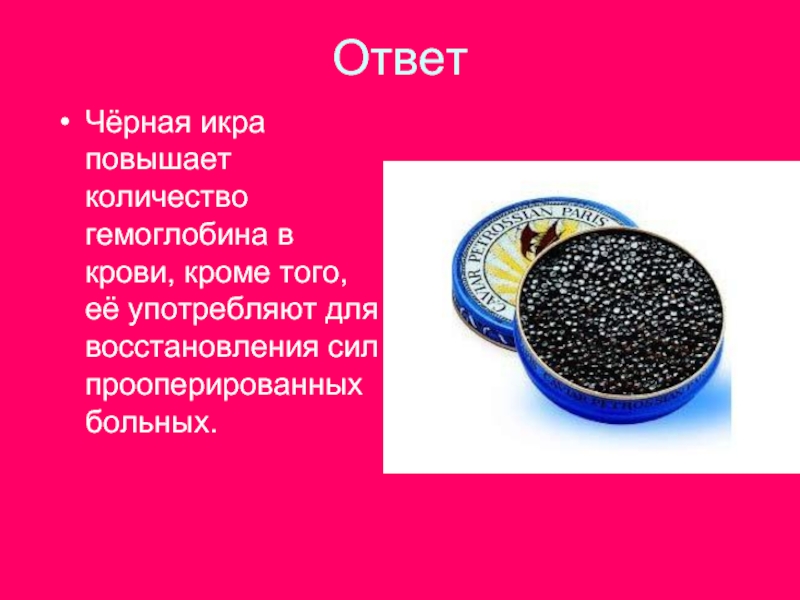 Чёрная икра повышает количество гемоглобина в крови, кроме того, её употребляют