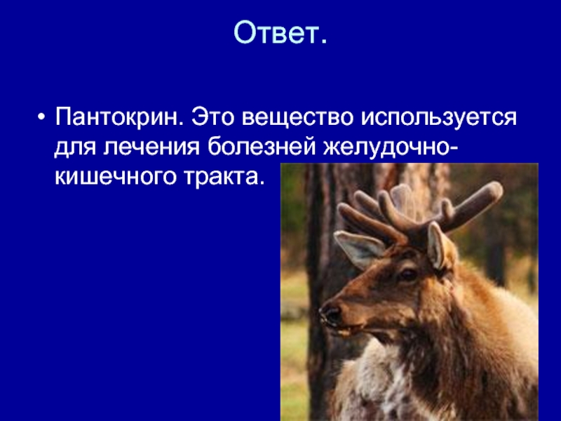 Пантокрин. Это вещество используется для лечения болезней желудочно-кишечного тракта.