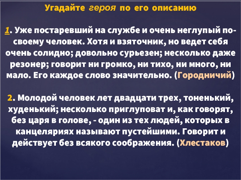 2. Молодой человек лет двадцати трех, тоненький, худенький; несколько приглуповат и, как говорят, без царя в голове, - один из тех людей, которых в канцеляриях называют пустейшими. Говорит и действует без всякого соображения. (Хлестаков)