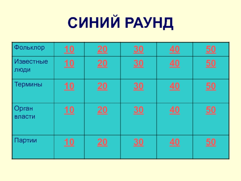 I — «Синий», вопросы оцениваются от 10 до 50 баллов;