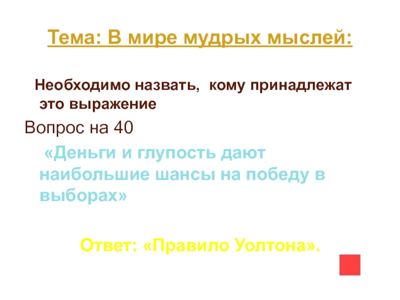 В викторине принимают участие три команды, которые, пользуясь приведенной ниже схемой, выбирают тему вопроса и его «стоимость». Право ответа принадлежит команде, первой поднявшей табличку со своим названием. В случае верного ответа на счет команды поступает количество баллов, соответствующее «стоимости» вопроса, и команда получает право выбора следующего вопроса. Если дан неправильный ответ, та же сумма со счета команды снимается и право ответить на этот вопрос переходит к другим командам.