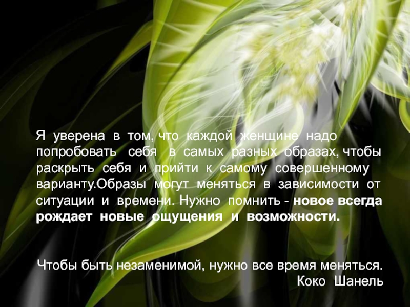 в самых разных образах, чтобы раскрыть себя и прийти к самому совершенному варианту.Образы могут меняться в зависимости от ситуации и времени. Нужно помнить - новое всегда рождает новые ощущения и возможнoсти.