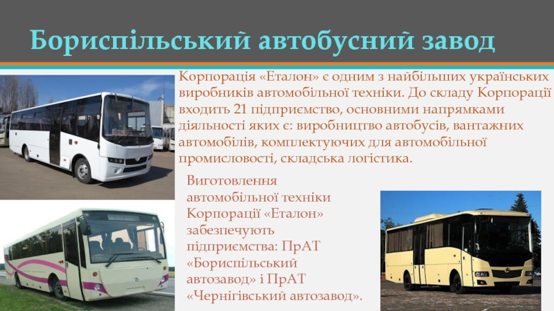 Виготовлення автомобільної техніки Корпорації «Еталон» забезпечують підприємства: ПрАТ «Бориспільський автозавод» і ПрАТ «Чернігівський автозавод».