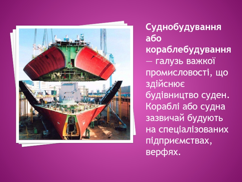 Слайд 3Суднобудування або кораблебудування — галузь важкої промисловості, що здійснює будівництво суден.