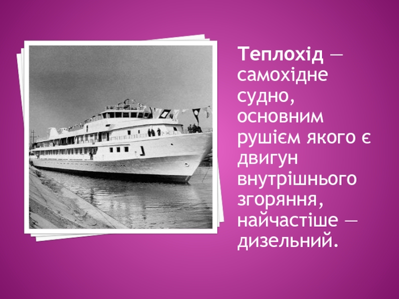 Слайд 2Теплохід — самохідне судно, основним рушієм якого є двигун внутрішнього згоряння,