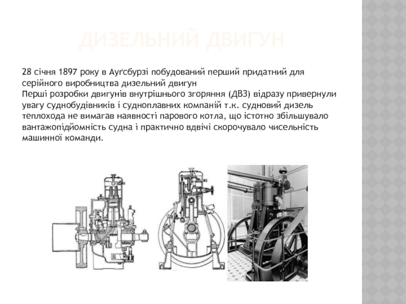 Перші розробки двигунів внутрішнього згоряння (ДВЗ) відразу привернули увагу суднобудівників і судноплавних компаній т.к. судновий дизель теплохода не вимагав наявності парового котла, що істотно збільшувало вантажопідйомність судна і практично вдвічі скорочувало чисельність машинної команди.