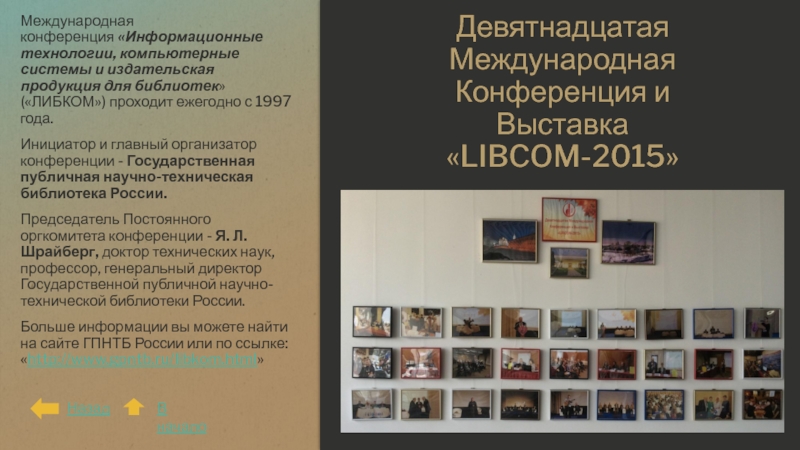 Яков Леонидович Шрайберг - доктор технических наук, профессор, вице-президент РБА, руководитель ГПНТБ России с 2006 года до этого 15 лет работы в должности первого заместителя директора ГПНТБ России. Организатор и Председатель постоянного оргкомитета по проведению Международных конференций «КРЫМ» и «ЛИБКОМ», ставшие знаковыми событиями для российского и мирового сообщества, участие в которых ежегодно принимают свыше тысячи специалистов.
