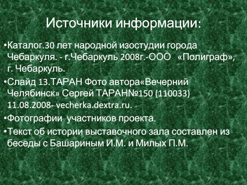 Текст об истории выставочного зала составлен из беседы с Башариным И.М. и Милых П.М.