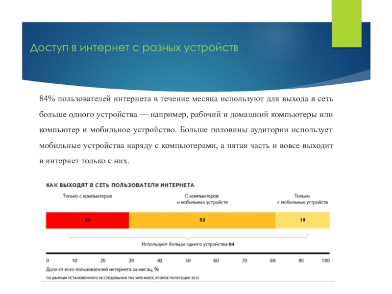 используют для выхода в сеть больше одного устройства — например, рабочий и домашний компьютеры или компьютер и мобильное устройство. Больше половины аудитории использует мобильные устройства наряду с компьютерами, а пятая часть и вовсе выходит в интернет только с них.