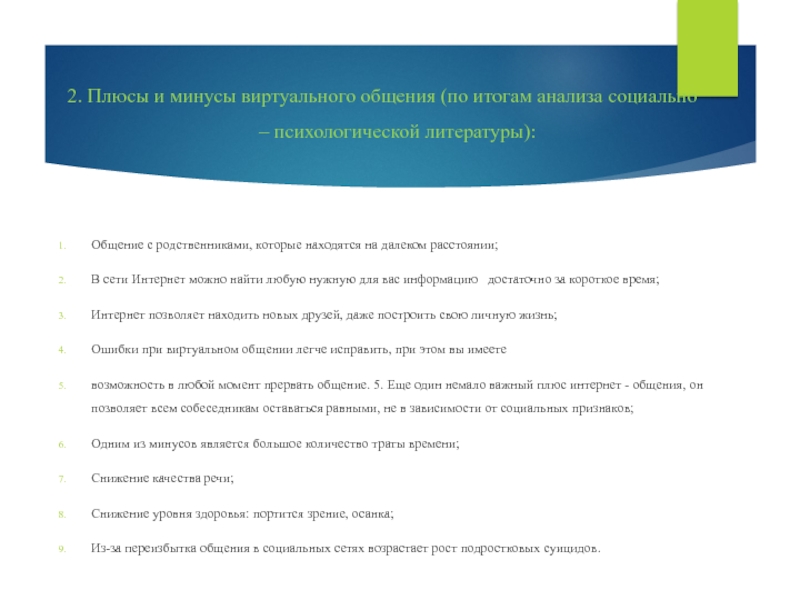 Слайд 232. Плюсы и минусы виртуального общения (по итогам анализа социально –