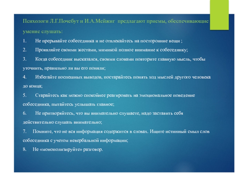 Слайд 7Психологи Л.Г.Почебут и И.А.Мейжиг предлагают приемы, обеспечивающие умение слушать: