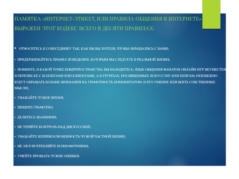 Слайд 27ПАМЯТКА «ИНТЕРНЕТ-ЭТИКЕТ, ИЛИ ПРАВИЛА ОБЩЕНИЯ В ИНТЕРНЕТЕ»