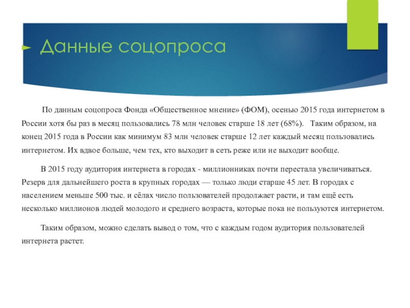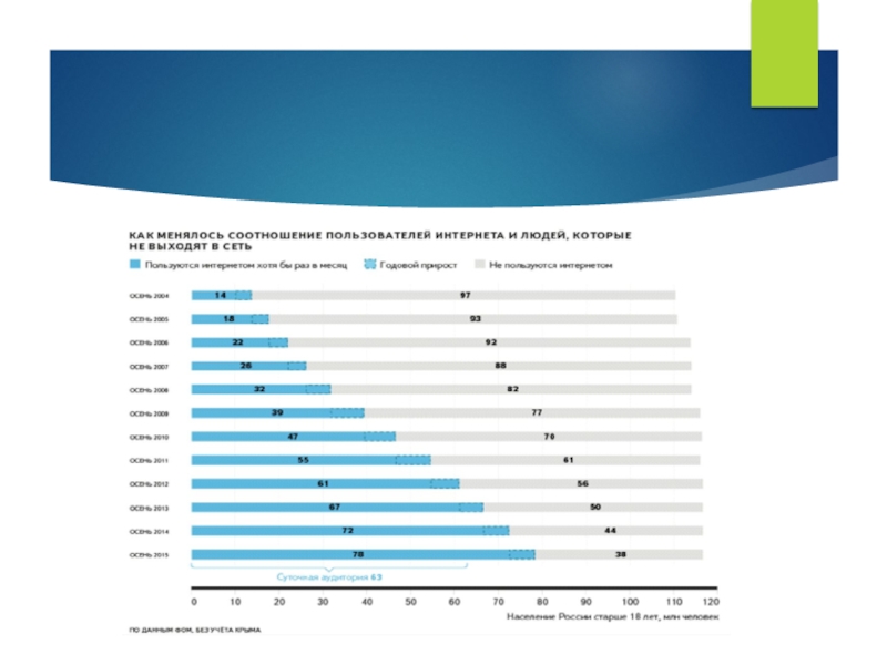 интернетом в России хотя бы раз в месяц пользовались 78 млн человек старше 18 лет (68%). Таким образом, на конец 2015 года в России как минимум 83 млн человек старше 12 лет каждый месяц пользовались интернетом. Их вдвое больше, чем тех, кто выходит в сеть реже или не выходит вообще.