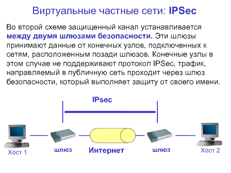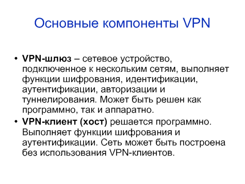 Слайд 8VPN-шлюз – сетевое устройство, подключенное к нескольким сетям, выполняет функции шифрования,