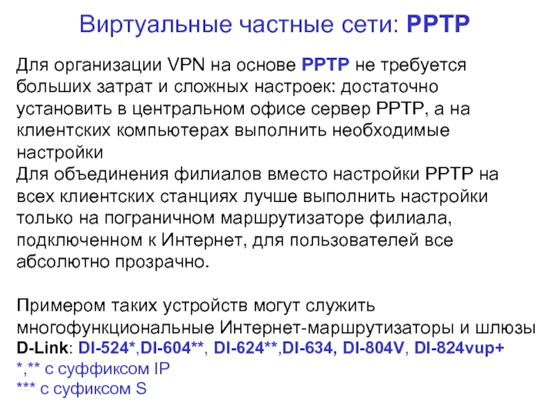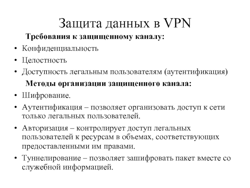 без проблем подключиться к сети офиса своей фирмы. Общедоступность данных совсем не означает их незащищенность. Система безопасности VPN - защищает всю информацию от несанкционированного доступа: информация передается в зашифрованном виде. Прочитать полученные данные может лишь обладатель ключа к шифру.