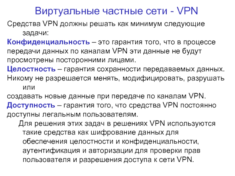 Для решения этих задач в решениях VPN используются такие средства как шифрование данных для обеспечения целостности и конфиденциальности, аутентификация и авторизации для проверки прав пользователя и разрешения доступа к сети VPN.
