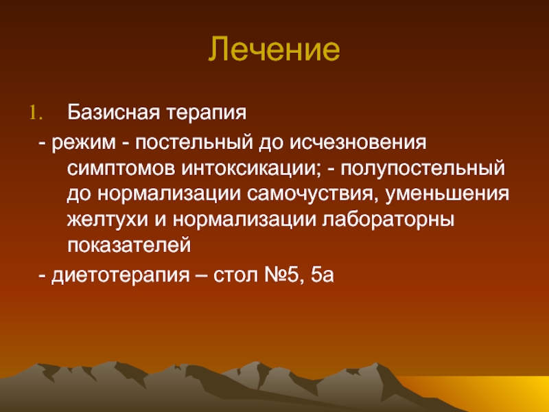 полупостельный до нормализации самочуствия, уменьшения желтухи и нормализации лабораторны показателей