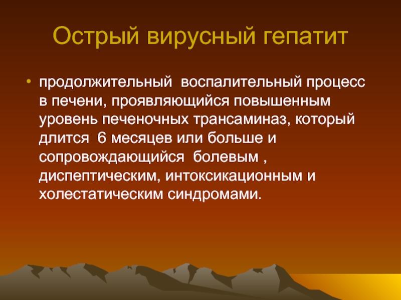 трансаминаз, который длится 6 месяцев или больше и сопровождающийся болевым , диспептическим, интоксикационным и холестатическим синдромами.