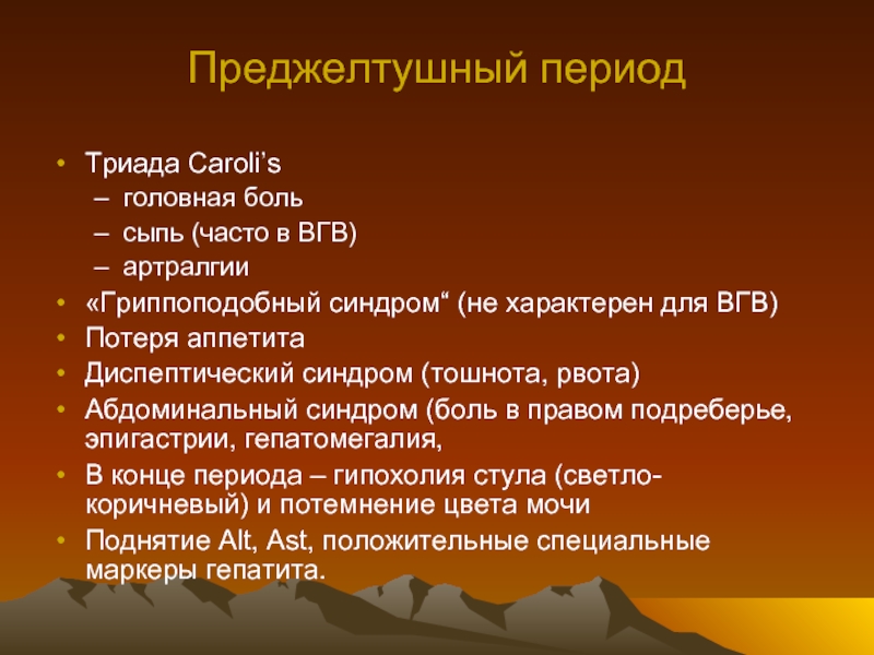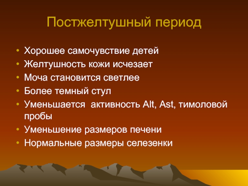 В конце периода – гипохолия стула (светло-коричневый) и потемнение цвета мочи