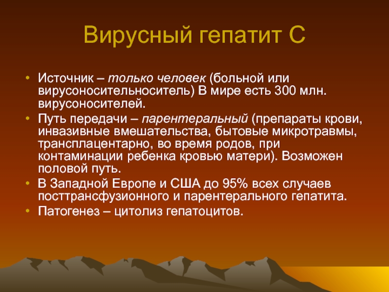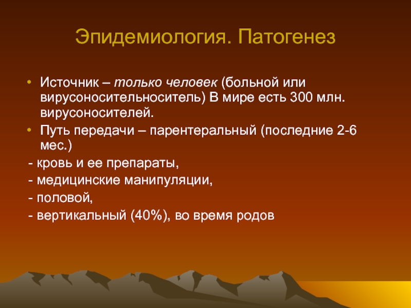 Путь передачи – парентеральный (препараты крови, инвазивные вмешательства, бытовые микротравмы, трансплацентарно, во время родов, при контаминации ребенка кровью матери). Возможен половой путь.