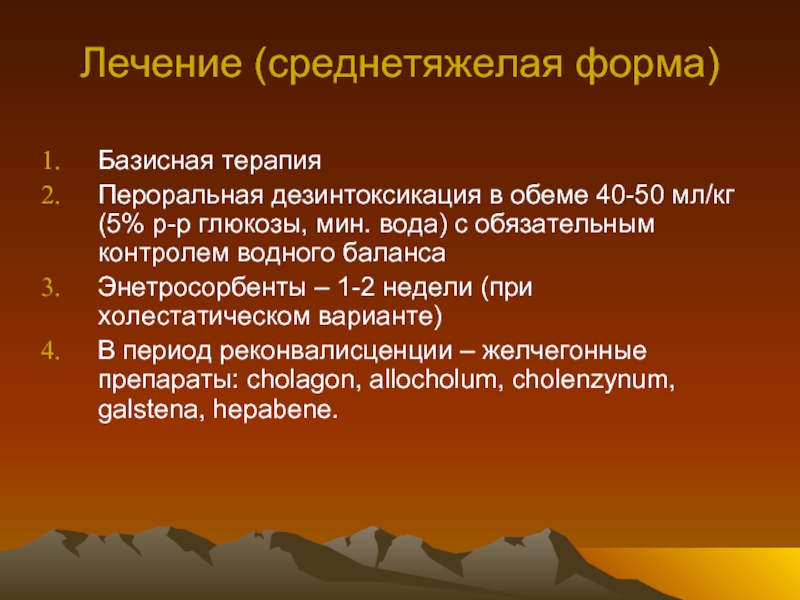 При наличии холестаза – дезоксихолиевая кислота 10г/кг, препараты урсодезоксихолевой кислоты (Урсосан, Урсофальк) 10-12 мг/кг и Гептрал (20-25 мг/кг) 2- 3 недели (при затяжном течении 3-6 мес)