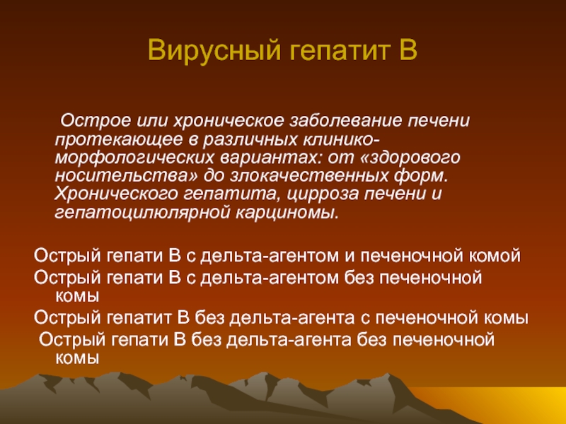 в различных клинико-морфологических вариантах: от «здорового носительства» до злокачественных форм. Хронического гепатита, цирроза печени и гепатоцилюлярной карциномы.