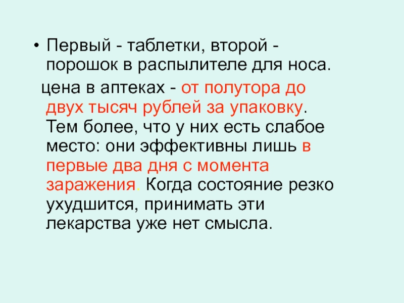Слайд 79Первый - таблетки, второй - порошок в распылителе для носа.