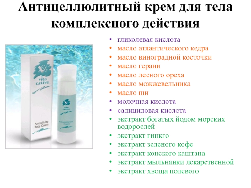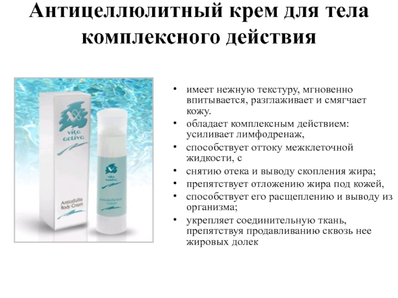 Слайд 40Антицеллюлитный крем для тела комплексного действия