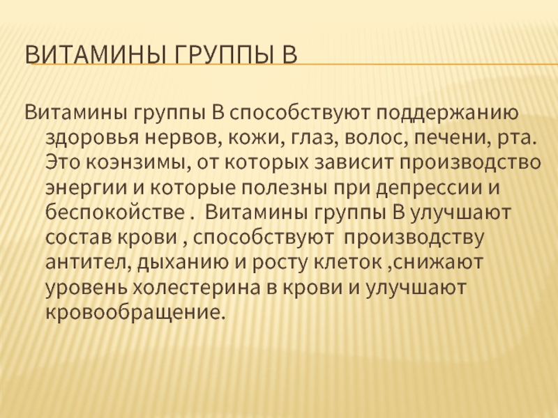 волос, печени, рта. Это коэнзимы, от которых зависит производство энергии и которые полезны при депрессии и беспокойстве . Витамины группы В улучшают состав крови , способствуют производству антител, дыханию и росту клеток ,снижают уровень холестерина в крови и улучшают кровообращение.