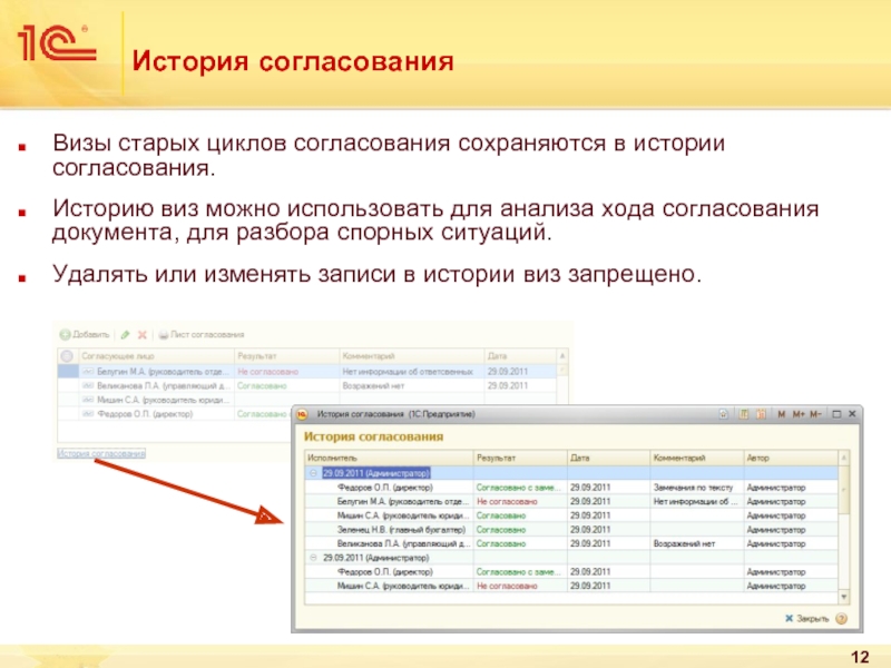 если в визах согласуемого документа уже есть ранее накопленные результаты согласования тех же самых исполнителей, то они будут перемещены в Историю согласования.