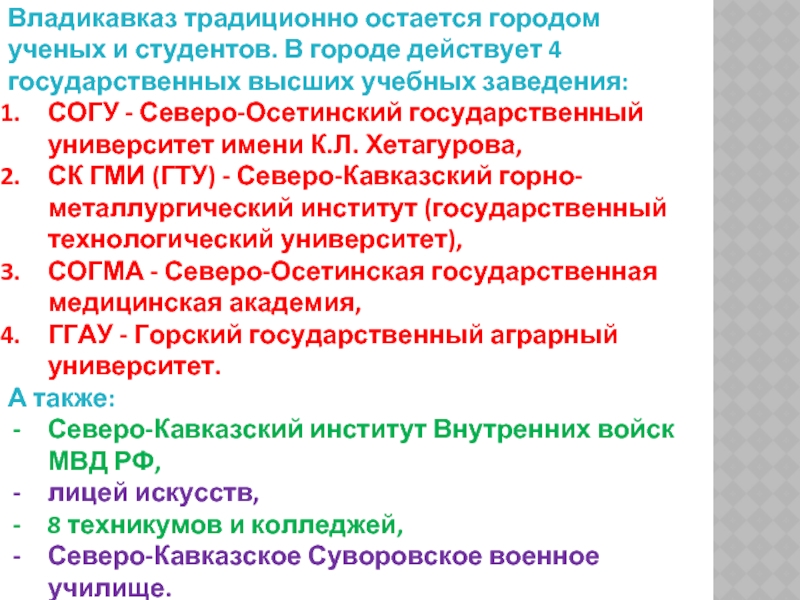 Слайд 24Владикавказ традиционно остается городом ученых и студентов. В городе действует 4