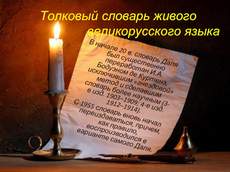 В начале 20 в. словарь Даля был существенно переработан И.А.Бодуэном де Куртенэ, исключившим «гнездовой» метод и сделавшим словарь более научным (3-е изд. 1903–1909; 4-е изд. 1912–1914).