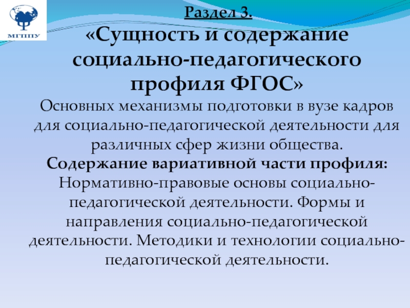 Содержание вариативной части профиля: Нормативно-правовые основы социально-педагогической деятельности. Формы и направления социально-педагогической деятельности. Методики и технологии социально-педагогической деятельности.