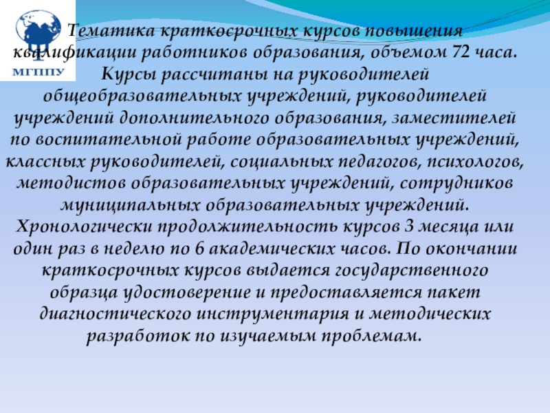 рассчитаны на руководителей общеобразовательных учреждений, руководителей учреждений дополнительного образования, заместителей по воспитательной работе образовательных учреждений, классных руководителей, социальных педагогов, психологов, методистов образовательных учреждений, сотрудников муниципальных образовательных учреждений. Хронологически продолжительность курсов 3 месяца или один раз в неделю по 6 академических часов. По окончании краткосрочных курсов выдается государственного образца удостоверение и предоставляется пакет диагностического инструментария и методических разработок по изучаемым проблемам.