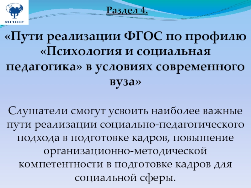 Слушатели смогут усвоить наиболее важные пути реализации социально-педагогического подхода в подготовке кадров, повышение организационно-методической компетентности в подготовке кадров для социальной сферы.