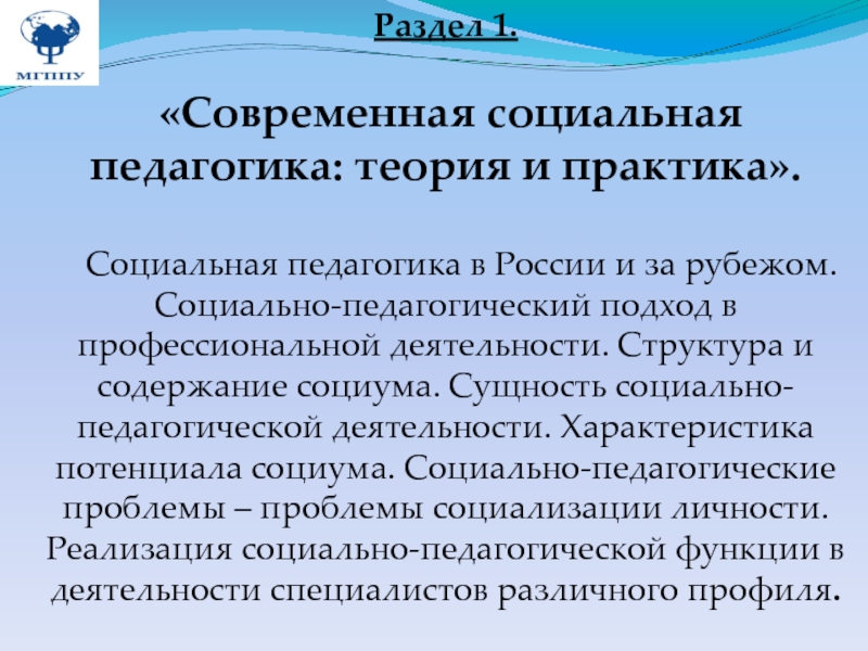 Социальная педагогика в России и за рубежом. Социально-педагогический подход в профессиональной деятельности. Структура и содержание социума. Сущность социально-педагогической деятельности. Характеристика потенциала социума. Социально-педагогические проблемы – проблемы социализации личности. Реализация социально-педагогической функции в деятельности специалистов различного профиля.