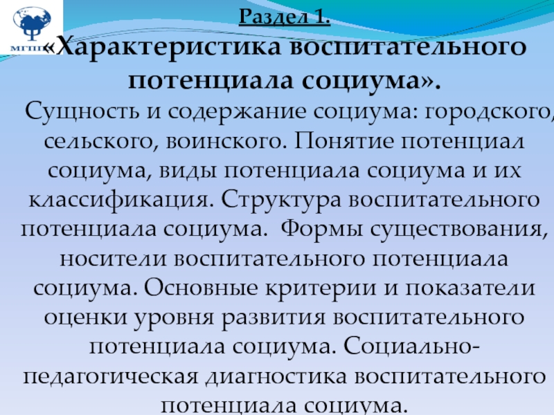 социума: городского, сельского, воинского. Понятие потенциал социума, виды потенциала социума и их классификация. Структура воспитательного потенциала социума. Формы существования, носители воспитательного потенциала социума. Основные критерии и показатели оценки уровня развития воспитательного потенциала социума. Социально-педагогическая диагностика воспитательного потенциала социума.