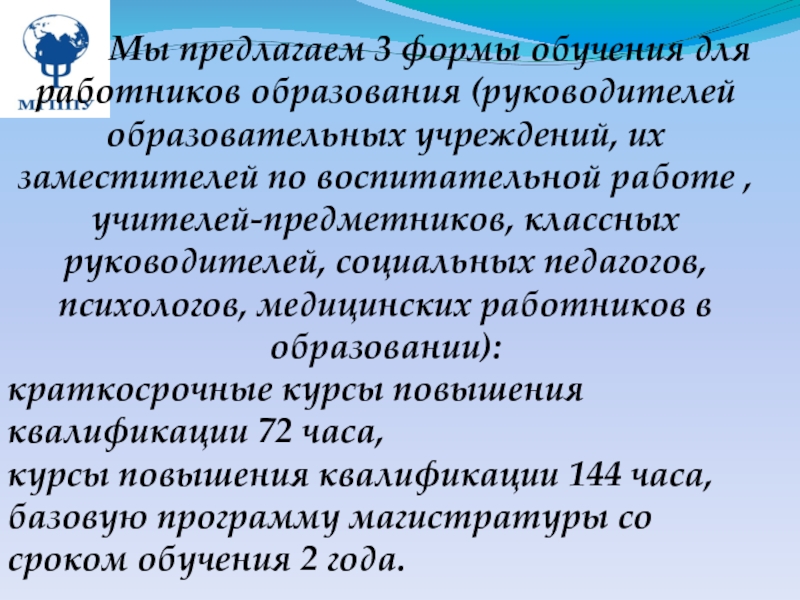 курсы повышения квалификации 144 часа, базовую программу магистратуры со сроком обучения 2 года.